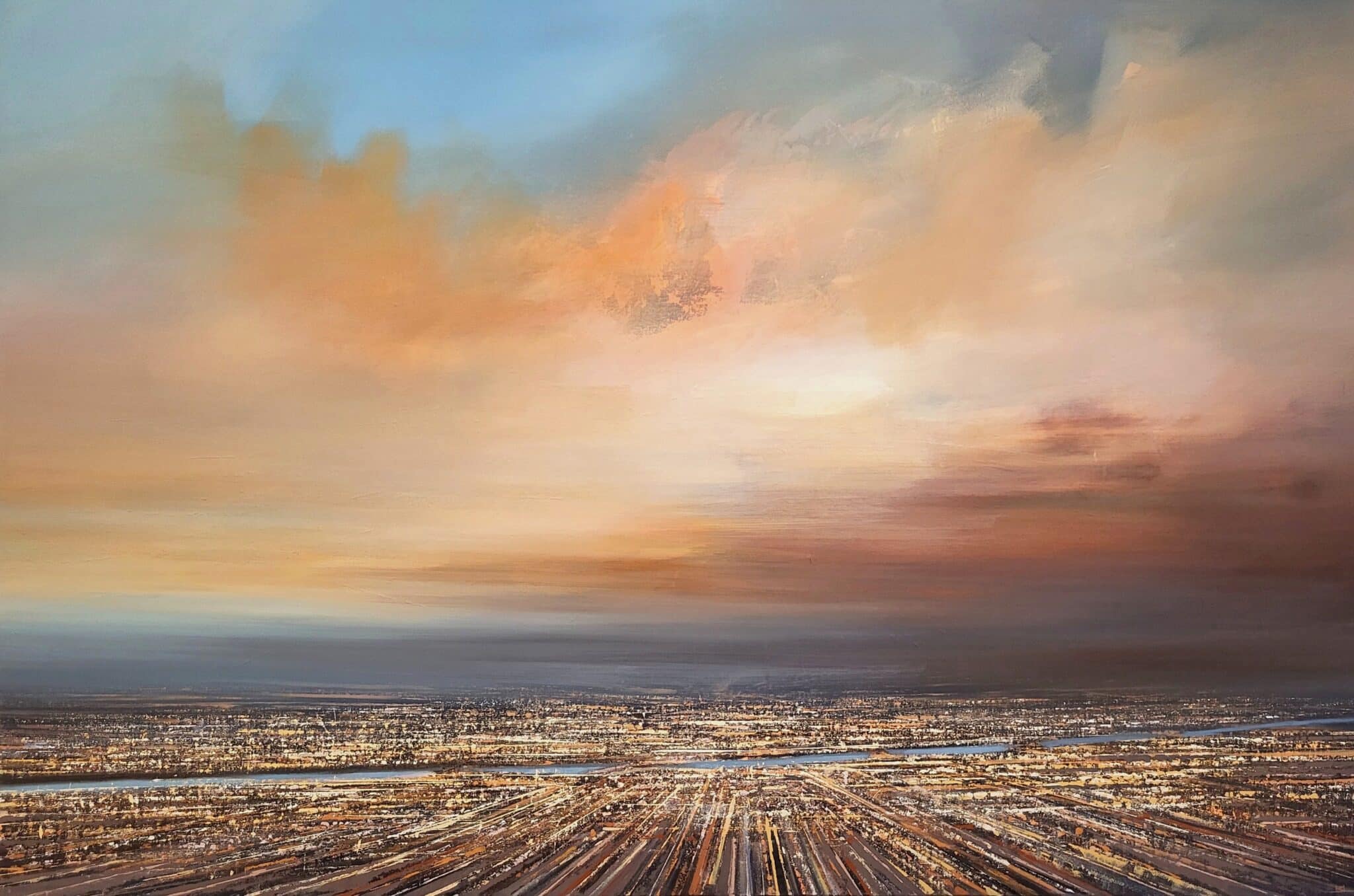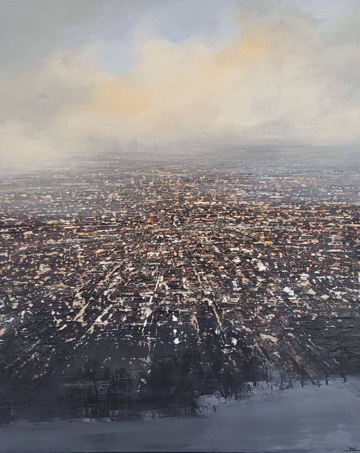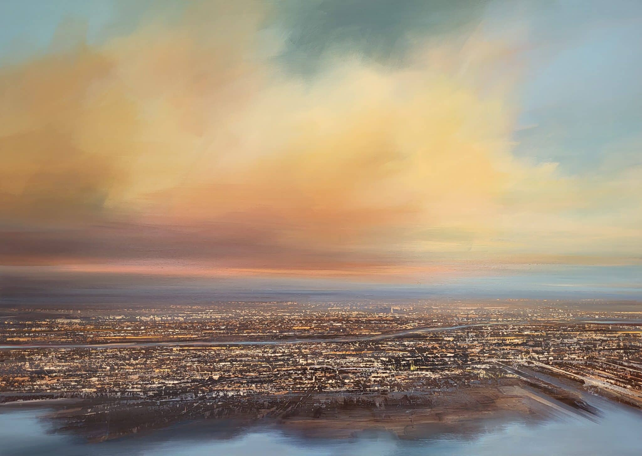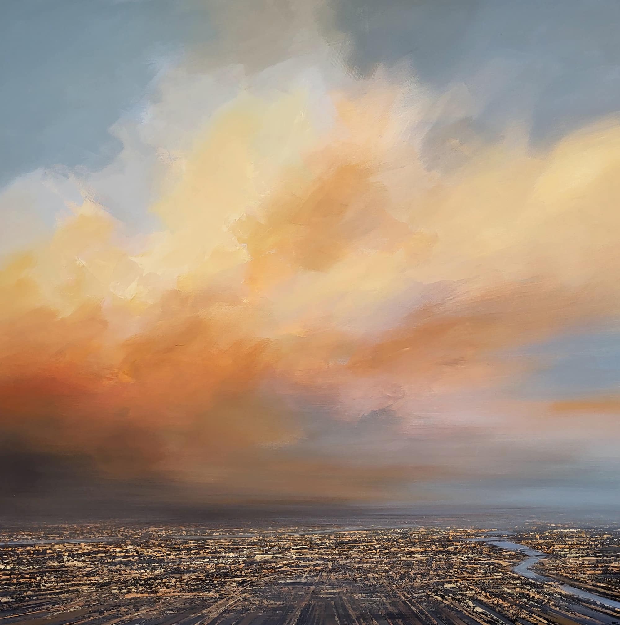 Je cherche à restituer dans mes toiles ces sensations et émotions, en tentant de capter le flottement de la lumière, de suivre la fuite des nuages, de pénétrer la trame des métropoles et leurs scintillements.