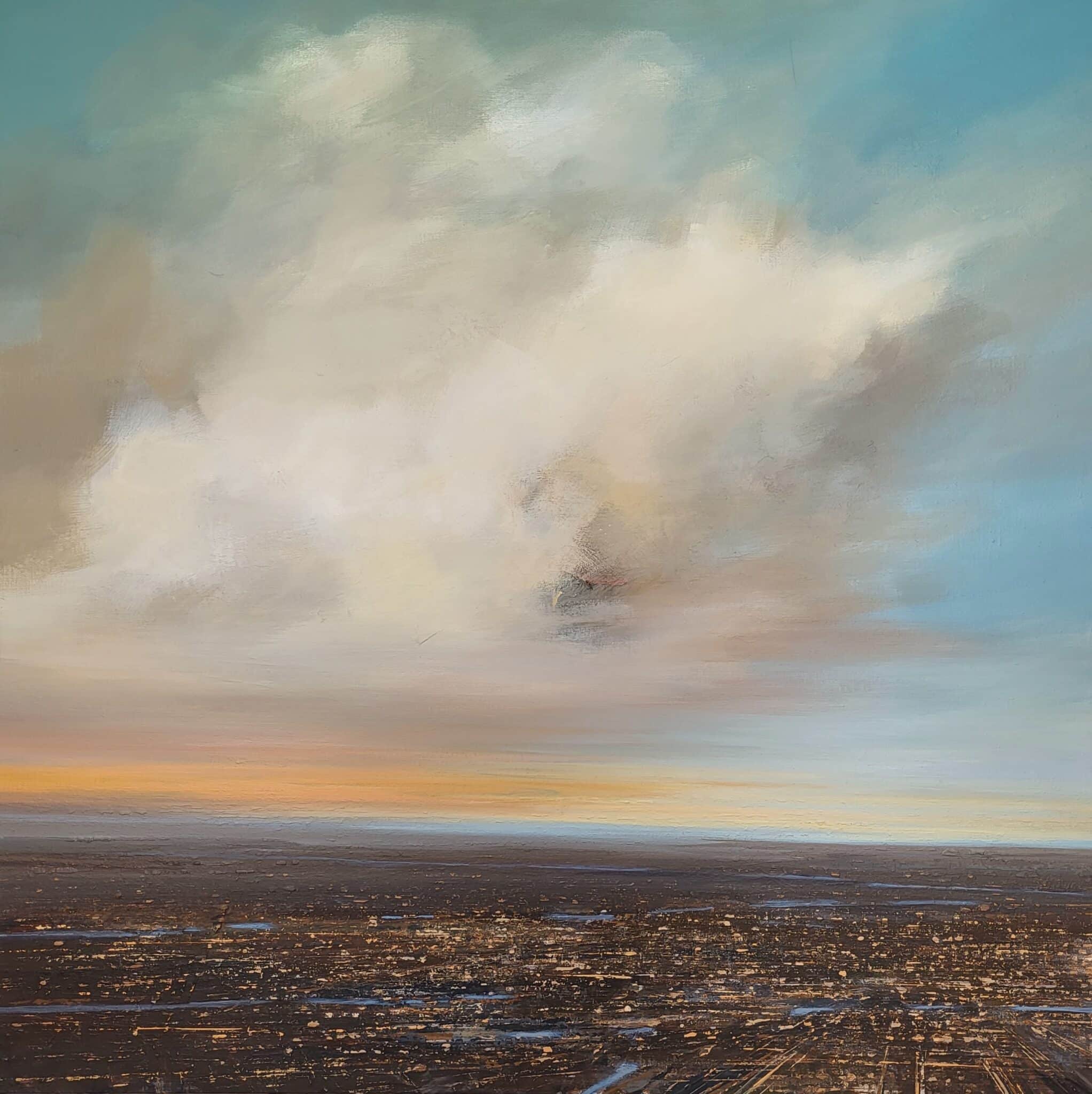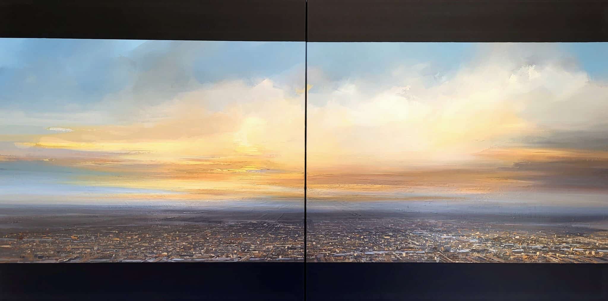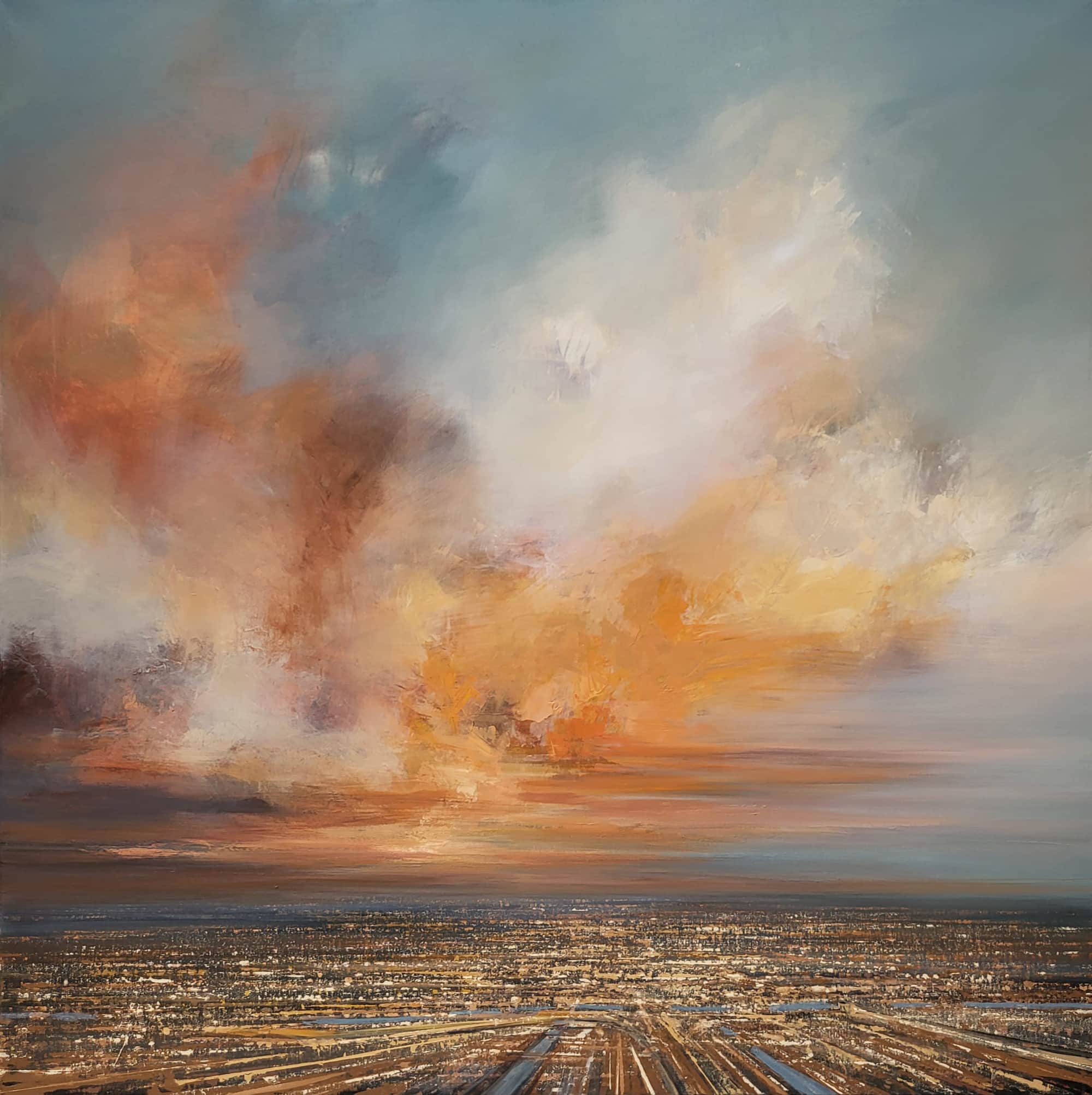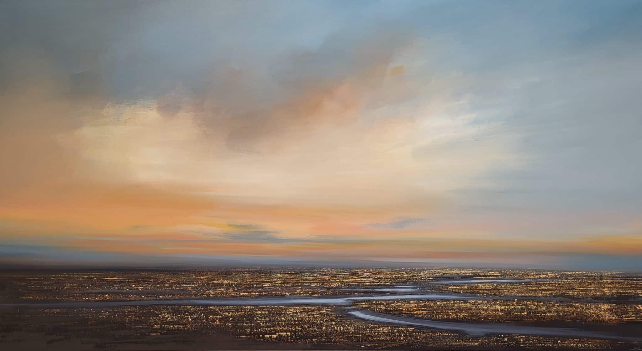 Je cherche à restituer dans mes toiles ces sensations et émotions, en tentant de capter le flottement de la lumière, de suivre la fuite des nuages, de pénétrer la trame des métropoles et leurs scintillements.