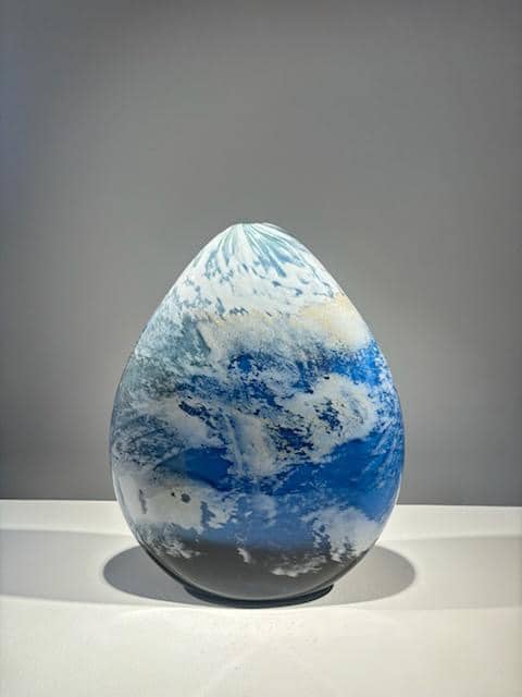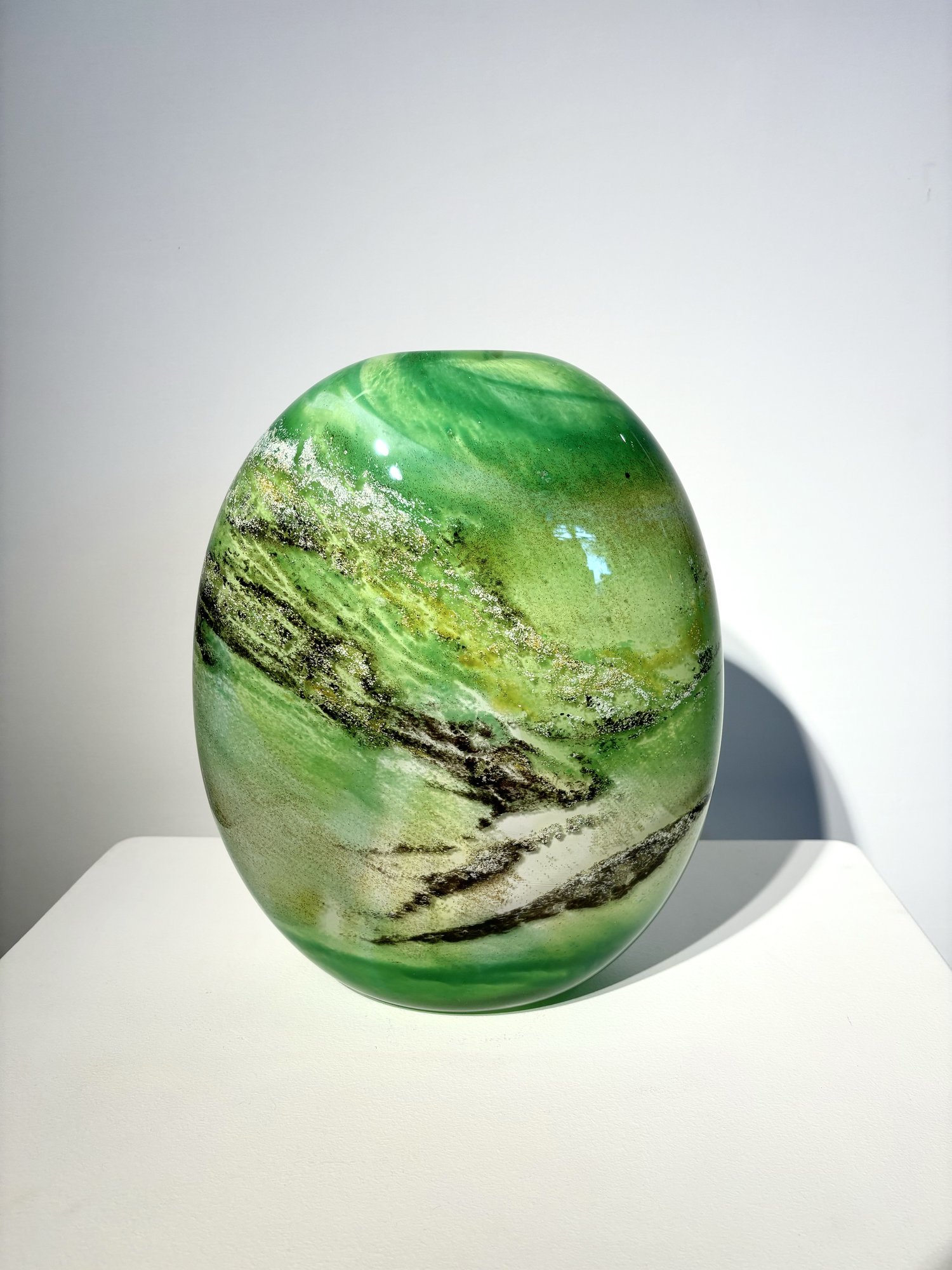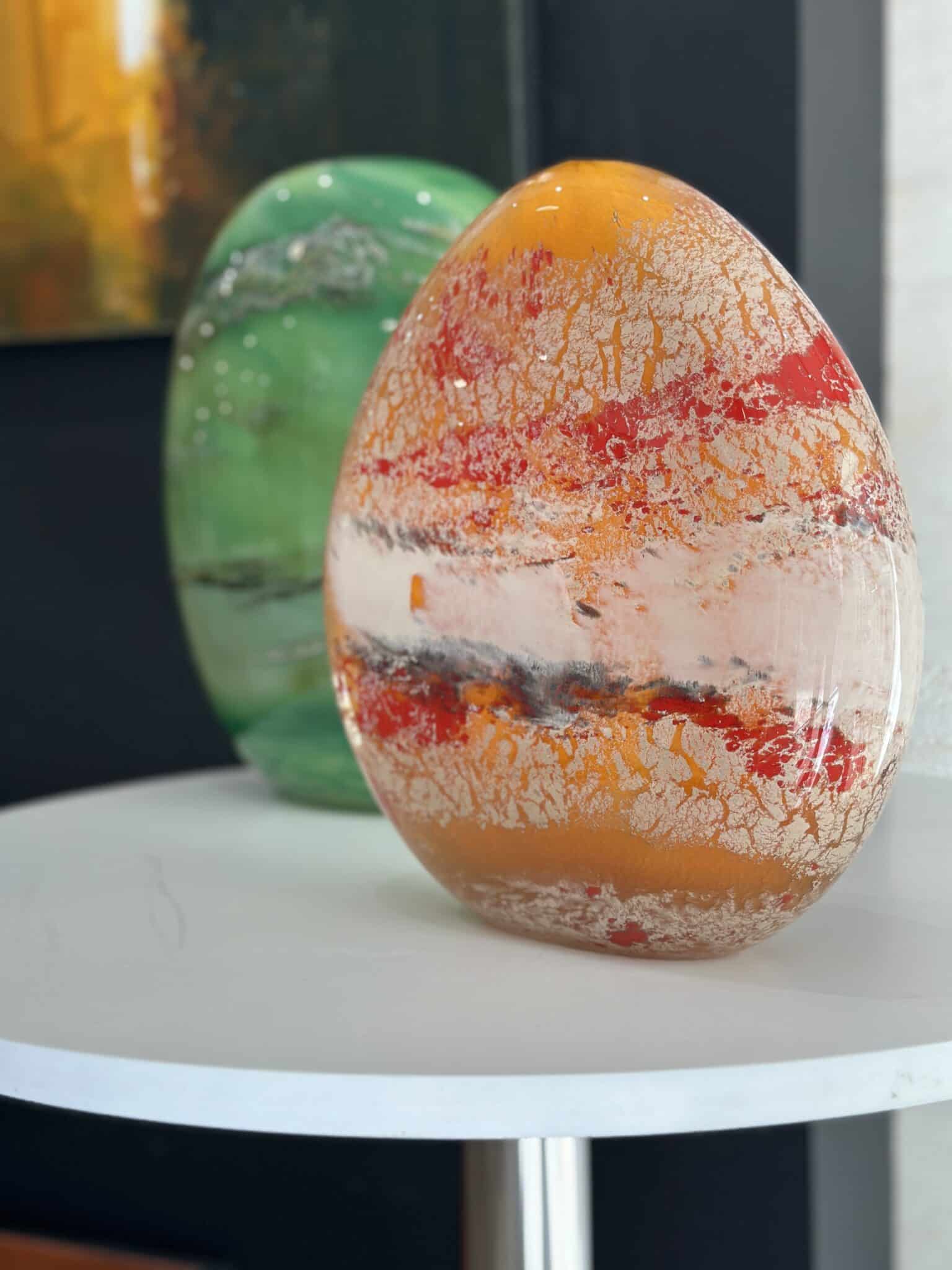 Dans ses séries d’œuvres Léo capture des instants suspendus, entre la terre, la pierre et l’eau. Il assemble du verre coloré et travaillé qu’il soumet à la chaleur, créant des œuvres aux formes et couleurs uniques. Chaque sculpture devient un instant figé de la nature : une montagne sous l’eau, une coulée de lave, ou encore les changements de couleurs d’un lever de soleil.